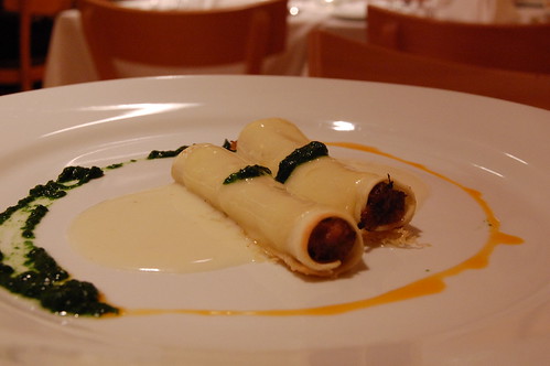 Fill your cannelloni tubes with the ragu, you may want to use a piping bag, and lay in a greased baking dish.