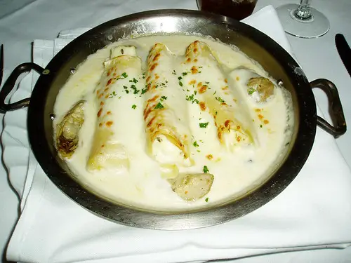 Spoon the bechamel sauce over the cannelloni and top with Parmesan cheese.