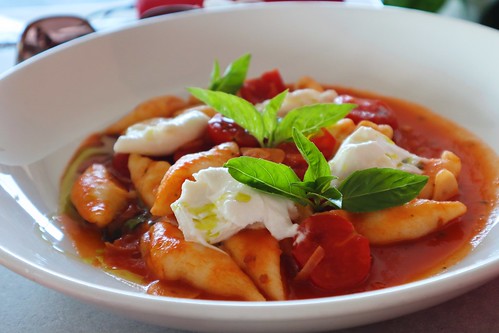 Transfer gnocchi and tomatoes to a platter, top with cut up burrata and basil leaves, and serve.