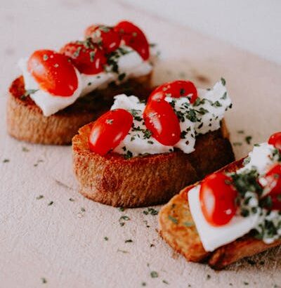 The star topping is a vibrant mix of roasted tomatoes and fresh basil. The tomatoes are roasted in the oven until they become soft, slightly caramelized, and their natural sweetness is intensified. Cherry or grape tomatoes work particularly well for this, and they’re often tossed with olive oil, garlic, and herbs before roasting. Once roasted, the tomatoes are spooned onto the ricotta-topped crostini and garnished with fresh basil leaves, which adds a bright, aromatic touch.