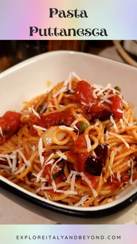 Pasta alla puttanesca is an Italian pasta dish that originated in Naples in the mid-20th century. It is made with ingredients such as olive oil, garlic, anchovies, olives, capers, tomatoes, and chili peppers. The dish is known for its strong flavors, and it is often served as a main course for lunch or dinner. The name of the dish comes from the Italian word for “prostitute,” and some believe that the dish was created by the prostitutes of Naples.