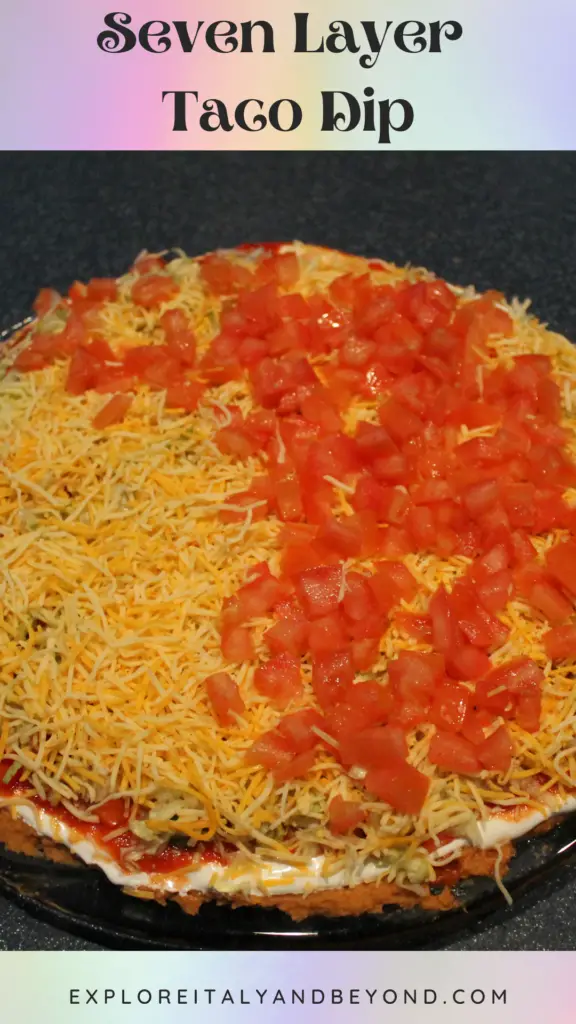This 7-layer taco dip is a delicious, flavorful appetizer that is sure to please a crowd. It has a layer of refried beans and is then followed by a layer of sour cream, salsa, diced tomatoes, shredded cheese and other toppings. The flavors of the taco dip come together to create a unique and mouth-watering combination. The seven layers provide a variety of textures and flavors that make it a crowd-pleasing appetizer. Serve it with tortilla chips, crackers or even fresh vegetables for a satisfying and flavorful snack.