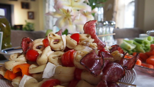 On small skewers or fancy toothpicks place 1 tortellini, 1 tomato, 1 mozzarella pearl, and 1 basil leaf. you can thread the basil leaf in between ingredients if desired.
